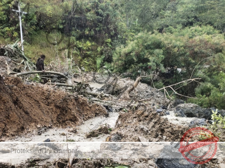 Akses menuju Puskesmas Karubaga dan PLTD Tolikara terputus akibat material tanah menutup badan jalan.