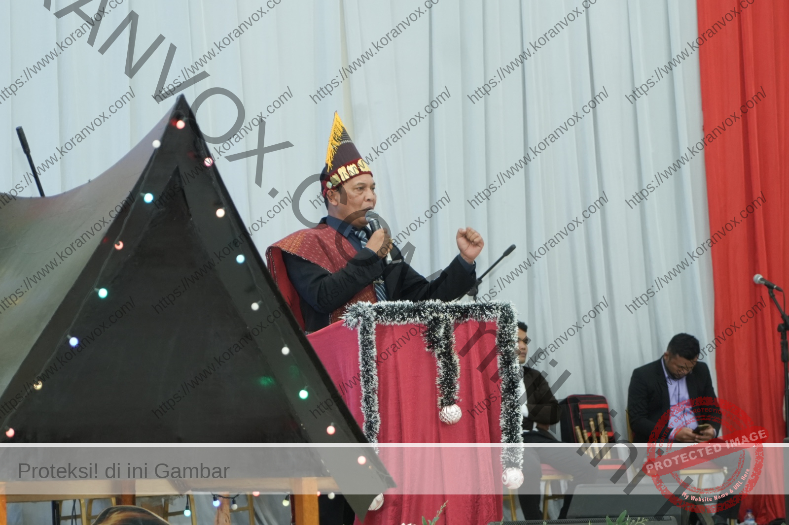 Ketua Ikatan Keluarga Batak Jayawijaya, Gotlif Sihombing memberikan sambutan perayaan Natal 2025 Ikatan Keluarga Batak Jayawijaya (IKB-J) di Wamena, Kabupaten Jayawijaya, Sabtu (27/12/2025).