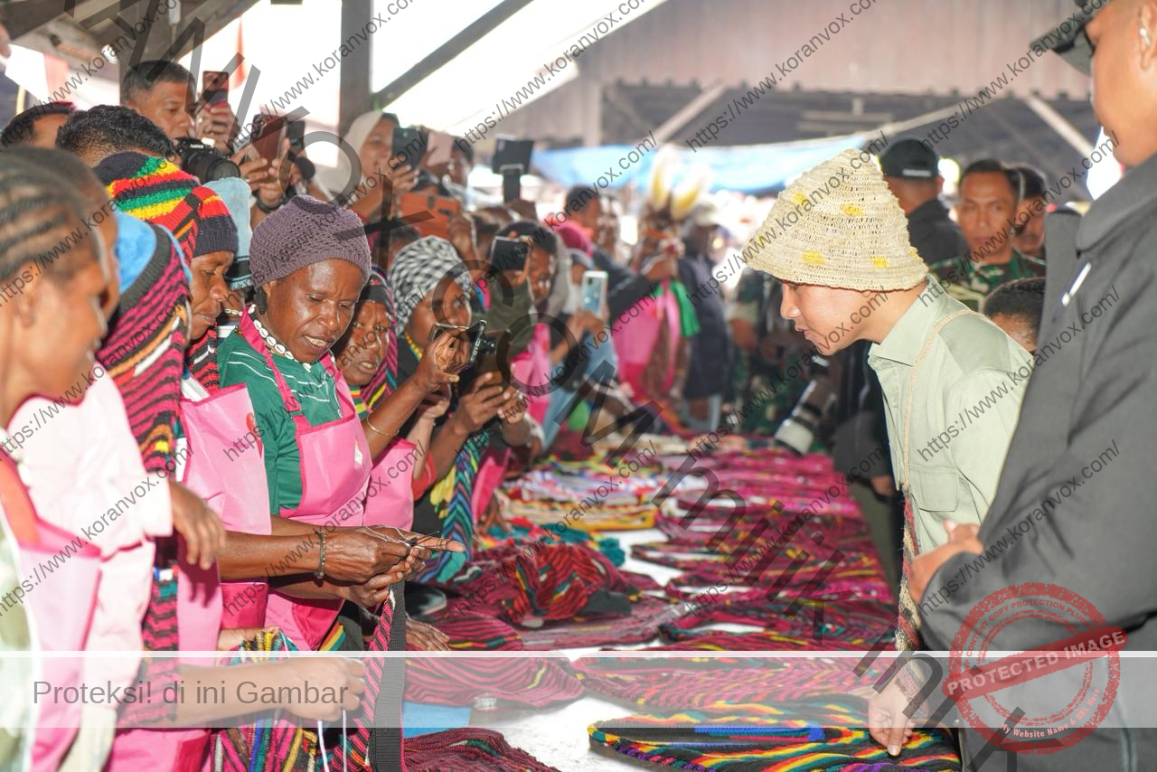 Wakil Presiden Gibran Rakabuming Raka meninjau lapak kerajinan noken dan kain khas Papua sambil menyapa mama-mama pedagang di Pasar Potikelek Kunjungan ini menunjukkan komitmen pemerintah dalam mendorong pemberdayaan UMKM dan pelaku ekonomi kreatif lokal.