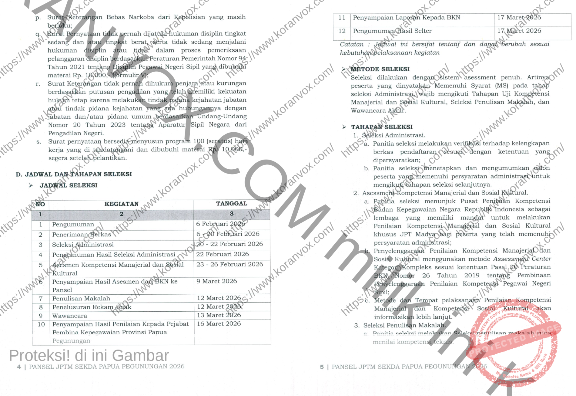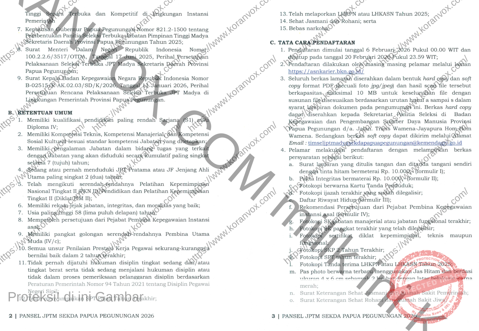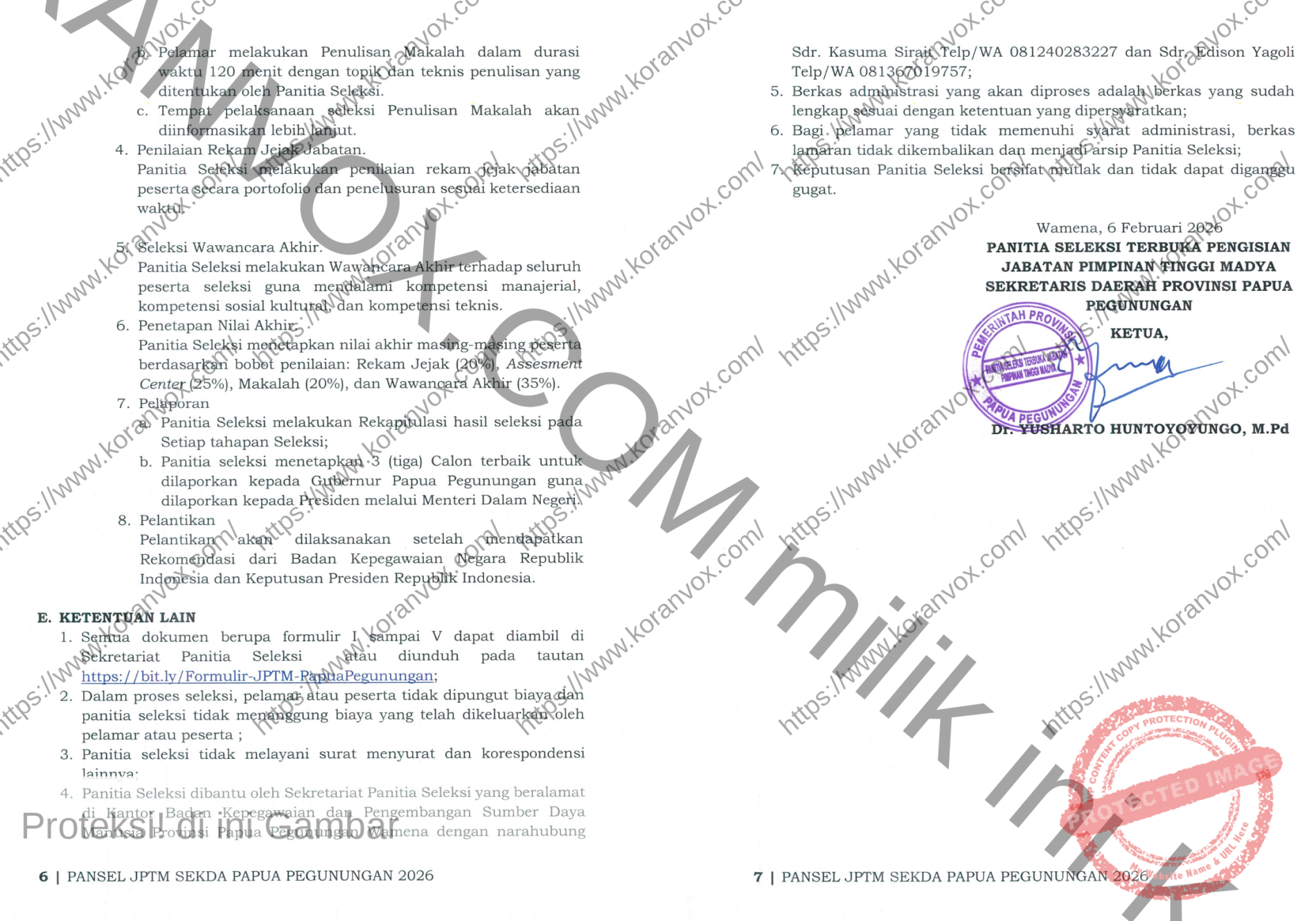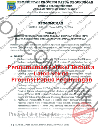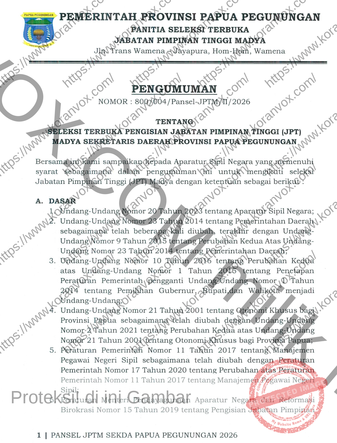 Pengumuman tersebut tertuang dalam Surat Nomor: 800/004/Pansel-JPTM/II/2026 tentang Seleksi Terbuka Pengisian Jabatan Pimpinan Tinggi (JPT) Madya Sekretaris Daerah Provinsi Papua Pegunungan, tertanggal 6 Februari 2026, yang ditandatangani Ketua Pansel Dr Yusharto Huntoyoyungo, M.Pd.